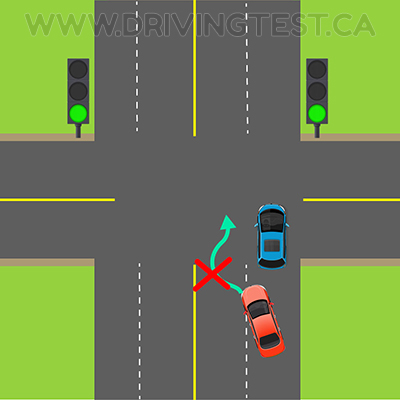 If you are stopped prior to making a left turn, where should the wheels of your vehicle be? |